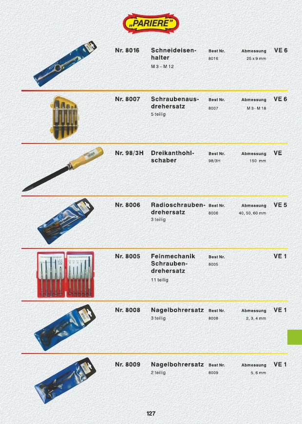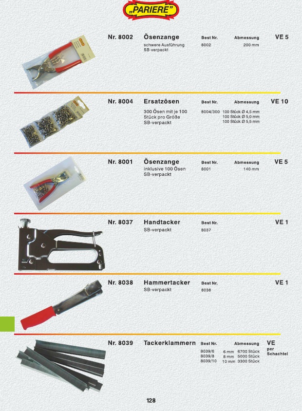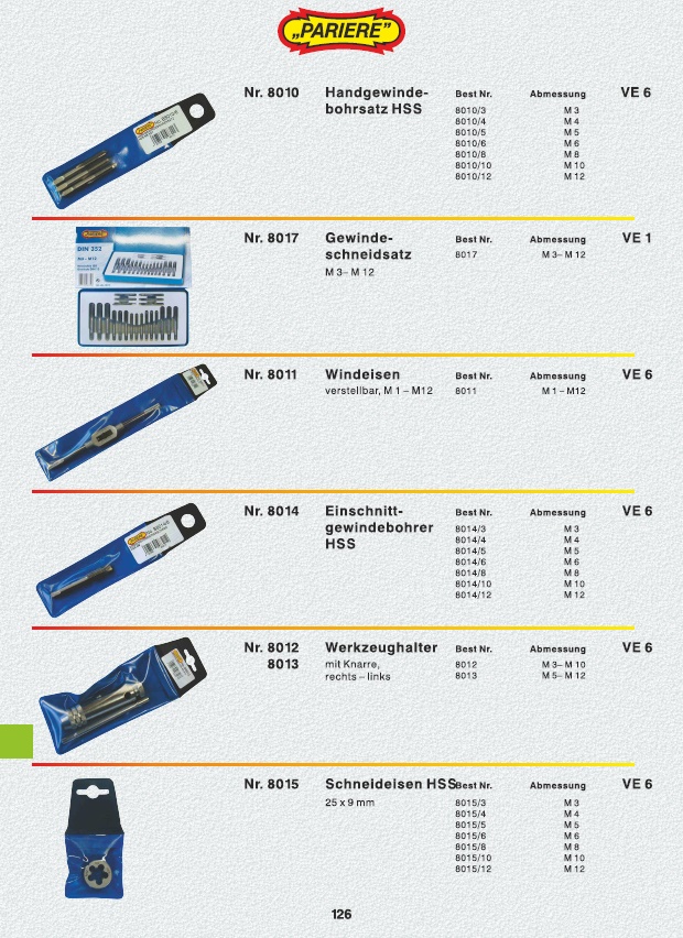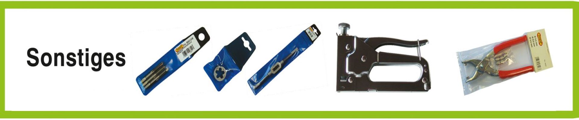 Handgewindebohrsatz, Gewindeschneidsatz, Windeisen, Einschnittgewindebohrer HSS, Werkzeughalter, Schneideisen HSS, Dreikanthohlschaber, Radioschraubendrehersatz, Feinmechanikschraubendrehersatz, Nagelbohrersatz, Ösenzange, Ersatzösen, Handtacker, Hammertacker, Tackerklammern